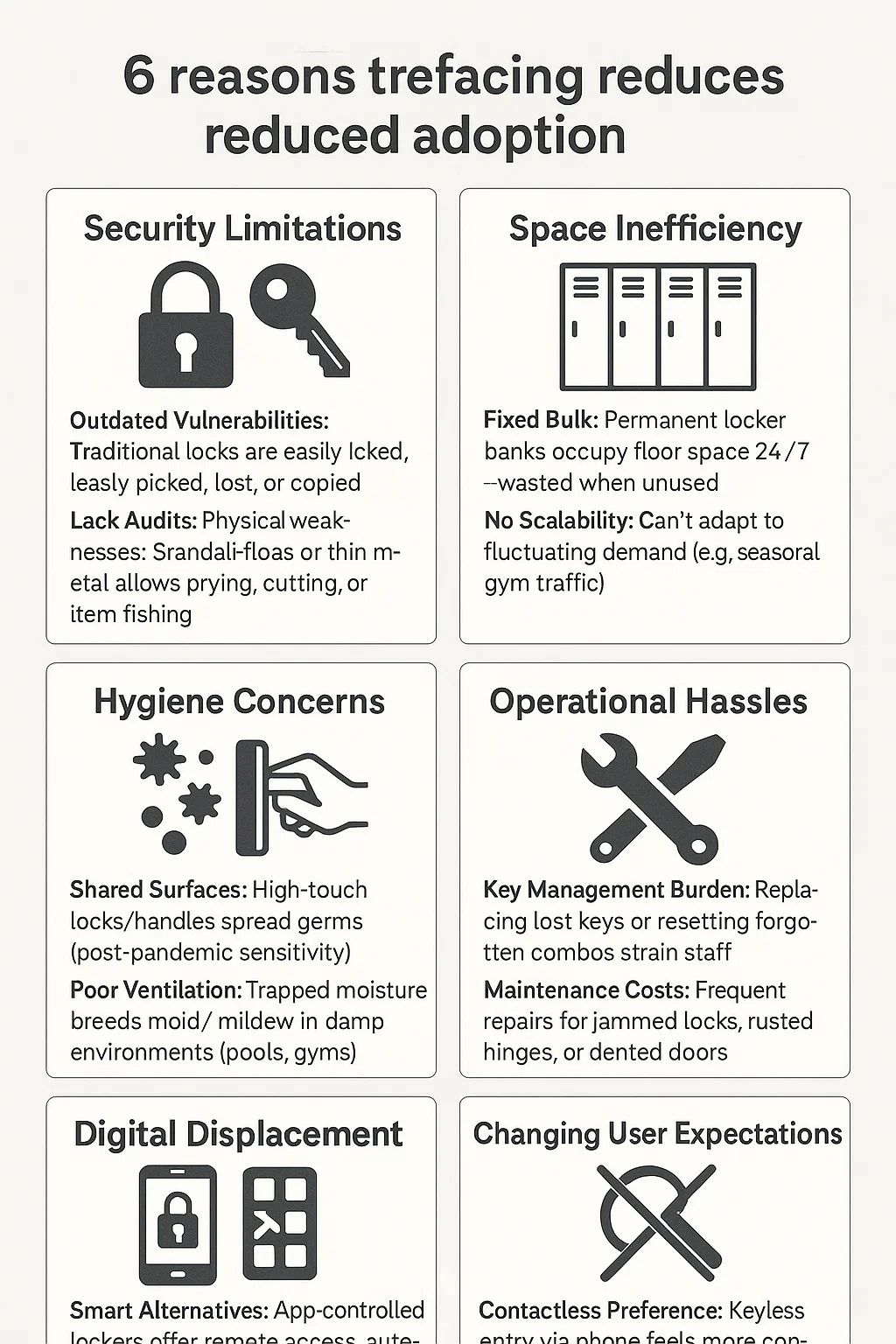 Utdaterte sårbarheter: Tradisjonelle låser (nøkler/kombinasjonsskiver) kan enkelt plukkes, mistes eller kopieres.